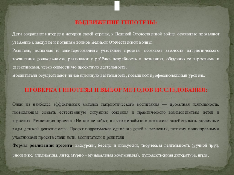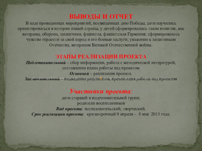 Один из наиболее эффективных методов патриотического воспитания — проектная деятельность, позволяющая создать естественную ситуацию общения и практического взаимодействия детей и взрослых. Реализация проекта «Ни кто не забыт, ни что не забыто!» позволила задействовать различные виды детской деятельности. Проект подразумевал единение детей и взрослых, поэтому полноправными участниками проекта стали дети, воспитатели и родители.