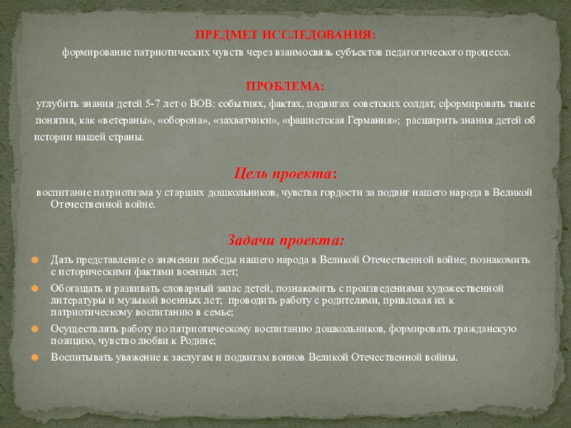 воспитание патриотизма у старших дошкольников, чувства гордости за подвиг нашего народа в Великой Отечественной войне.