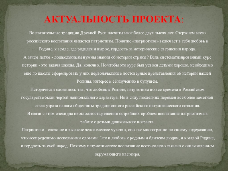 Исторически сложилось так, что любовь к Родине, патриотизм во все времена в Российском государстве были чертой национального характера. Но в силу последних перемен все более заметной стала утрата нашим обществом традиционного российского патриотического сознания.