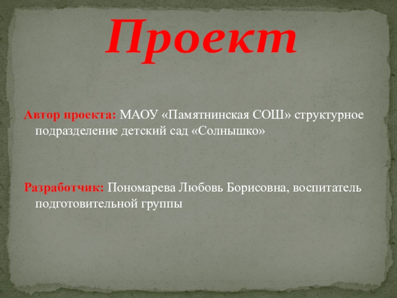 Автор проекта: МАОУ «Памятнинская СОШ» структурное подразделение детский сад «Солнышко»