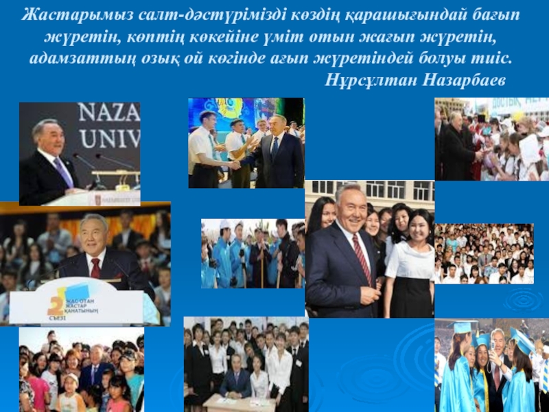 Слайд 13Жастарымыз салт-дәстүрімізді көздің қарашығындай бағып жүретін, көптің көкейіне үміт отын жағып
