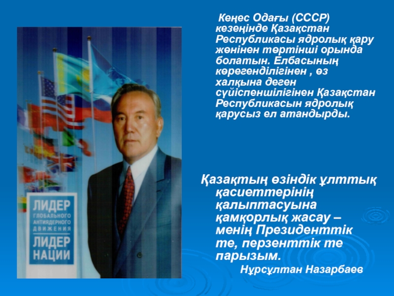 қару жөнінен төртінші орында болатын. Елбасының көрегенділігінен , өз халқына деген сүйіспеншілігінен Қазақстан Республикасын ядролық қарусыз ел атандырды.