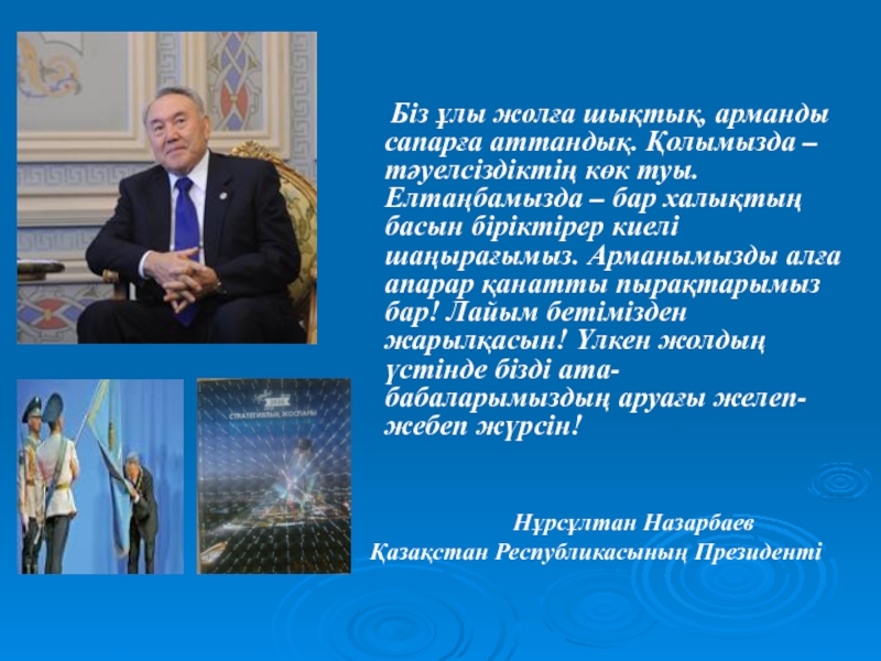 Слайд 18 Біз ұлы жолға шықтық, арманды сапарға аттандық. Қолымызда – Тәуелсіздіктің