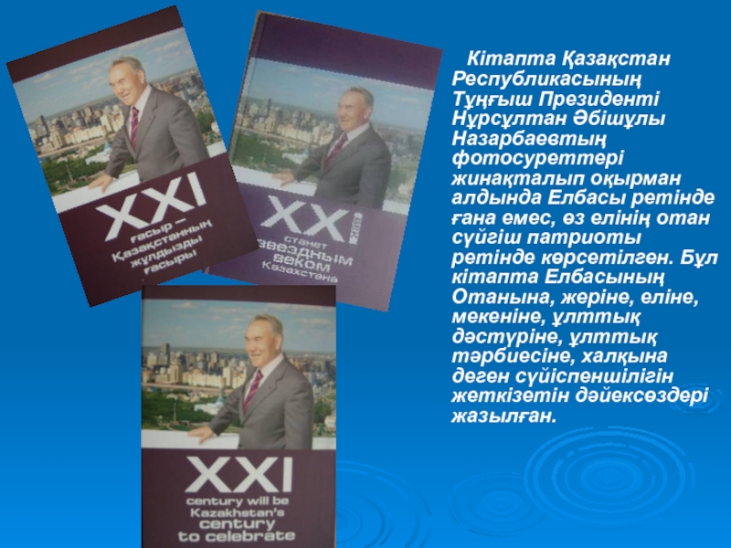 Кітапта Қазақстан Республикасының Тұңғыш Президенті Нұрсұлтан Әбішұлы Назарбаевтың фотосуреттері