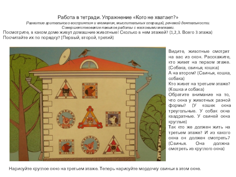 Видите, животные смотрят на вас из окон. Расскажите, кто живет на первом этаже. (Собака, свинья, кошка)