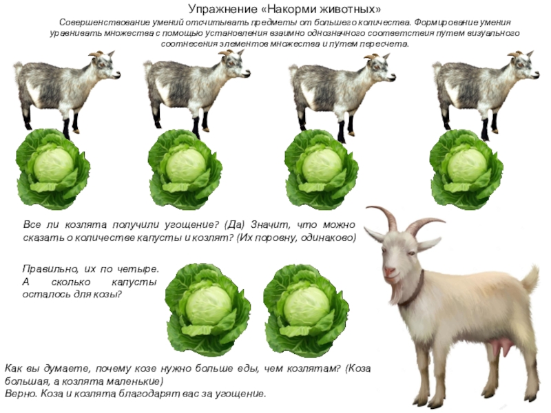 Все ли козлята получили угощение? (Да) Значит, что можно сказать о количестве капусты и козлят? (Их поровну, одинаково)