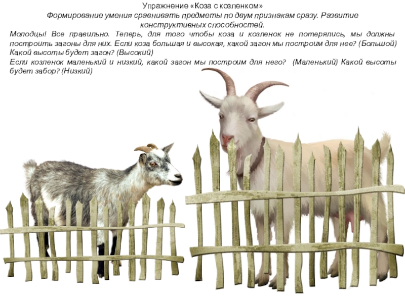Молодцы! Все правильно. Теперь, для того чтобы коза и козленок не потерялись, мы должны построить загоны для них. Если коза большая и высокая, какой загон мы построим для нее? (Большой) Какой высоты будет загон? (Высокий)