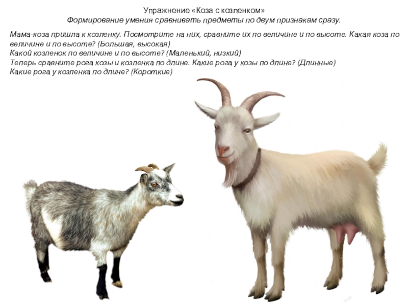Мама-коза пришла к козленку. Посмотрите на них, сравните их по величине и по высоте. Какая коза по величине и по высоте? (Большая, высокая)