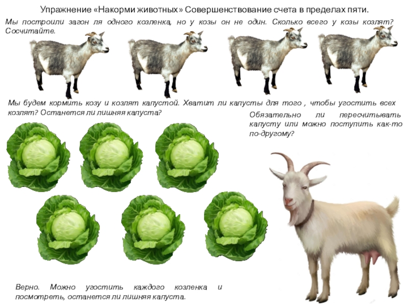 Мы будем кормить козу и козлят капустой. Хватит ли капусты для того , чтобы угостить всех козлят? Останется ли лишняя капуста?