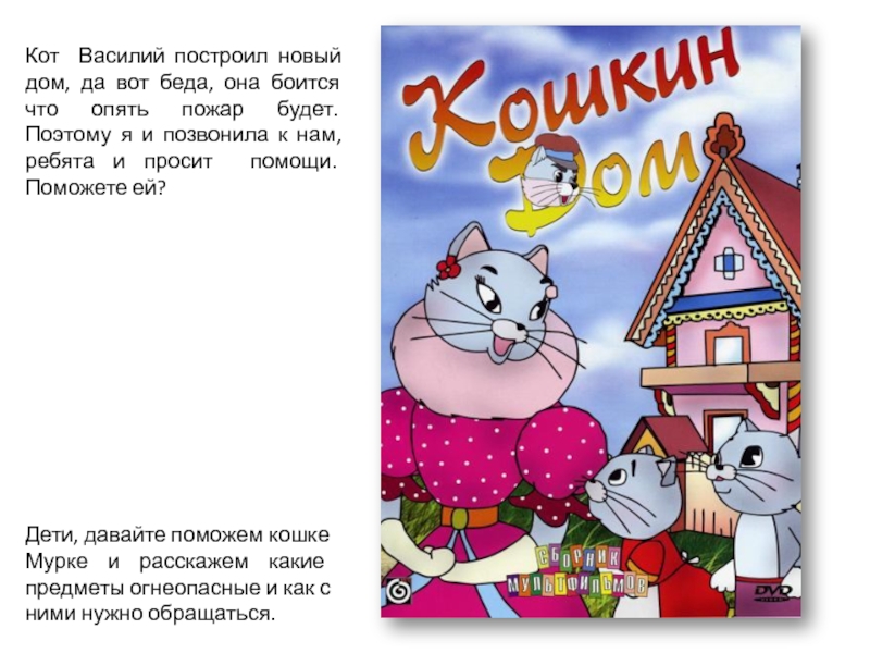 Дети, давайте поможем кошке Мурке и расскажем какие предметы огнеопасные и как с ними нужно обращаться.