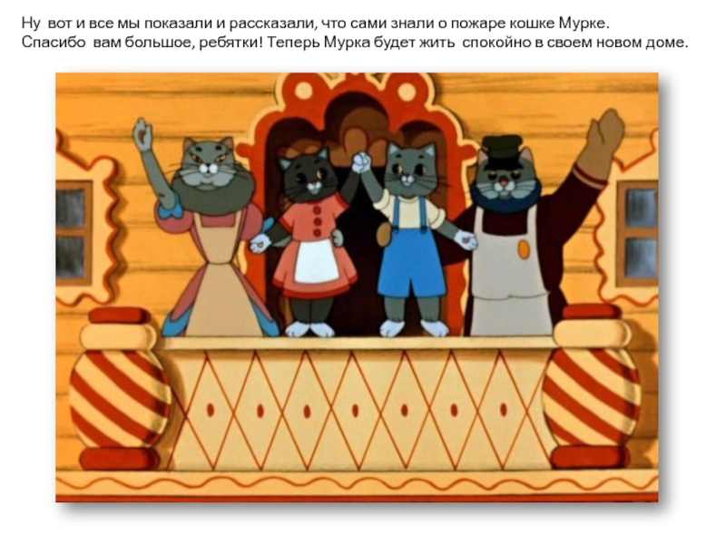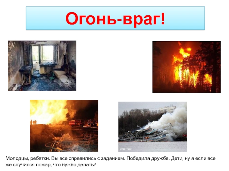 Молодцы, ребятки. Вы все справились с заданием. Победила дружба. Дети, ну а если все же случился пожар, что нужно делать?