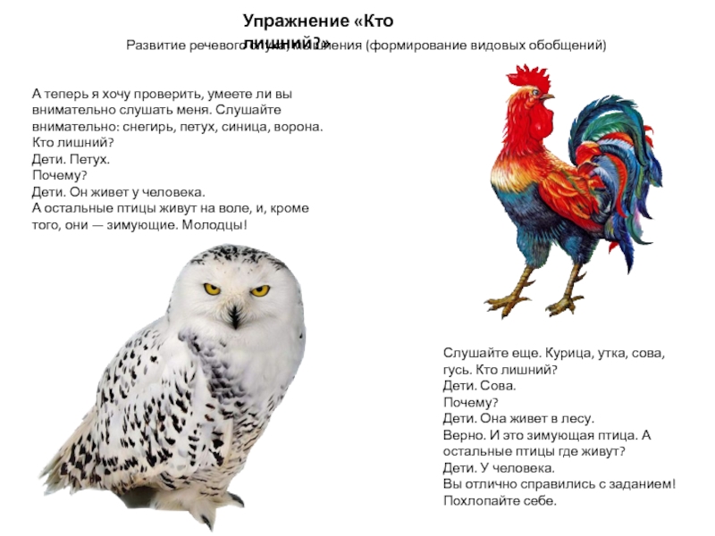 Слушайте еще. Курица, утка, сова, гусь. Кто лишний?