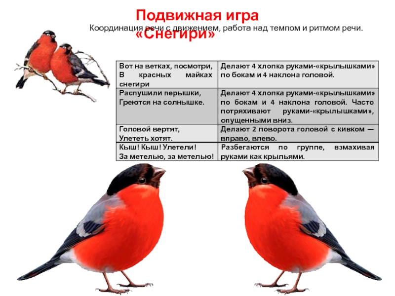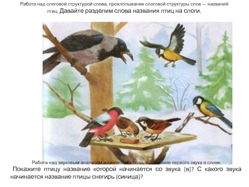 Работа над слоговой структурой слова, прохлопывание слоговой структуры слов — названий птиц. Давайте разделим слова названия птиц на слоги.