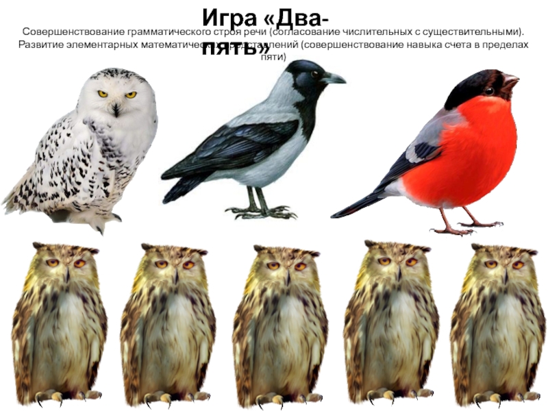 Посмотрите внимательно и запомните, где находятся птички. Сейчас вы закроете глаза, а я уберу одну из них. Открыв глаза, вы скажете, кого не стало. Закройте глаза.
