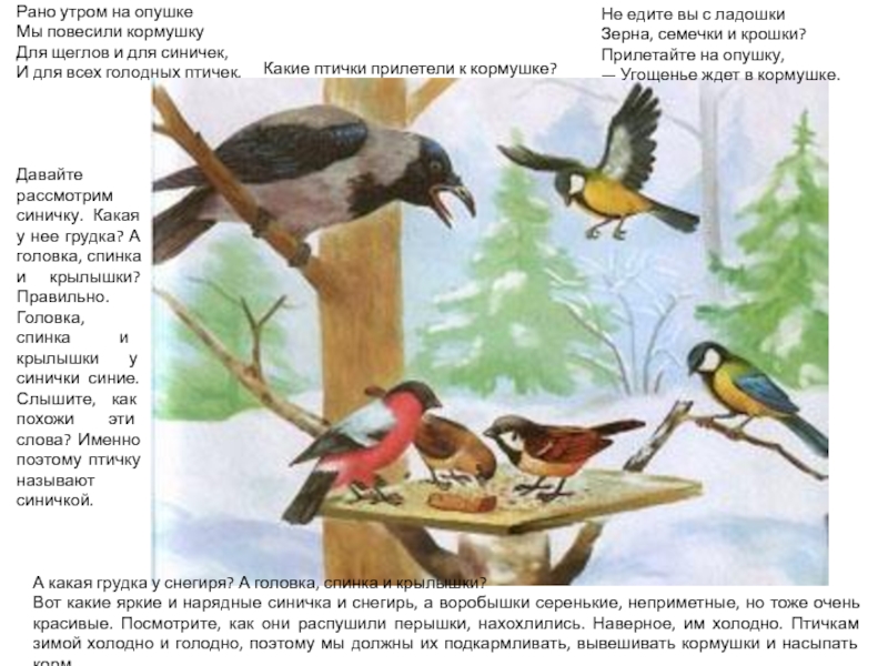 Вот какие яркие и нарядные синичка и снегирь, а воробышки серенькие, неприметные, но тоже очень красивые. Посмотрите, как они распушили перышки, нахохлились. Наверное, им холодно. Птичкам зимой холодно и голодно, поэтому мы должны их подкармливать, вывешивать кормушки и насыпать корм.