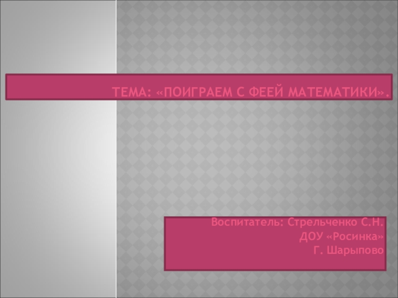 ТЕМА: «ПОИГРАЕМ С ФЕЕЙ МАТЕМАТИКИ». Воспитатель: Стрельченко С.Н. ДОУ «Росинка»Г. Шарыпово