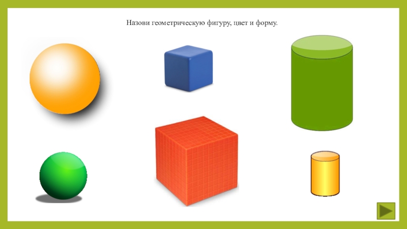 Слайд 7Назови геометрическую фигуру, цвет и форму.