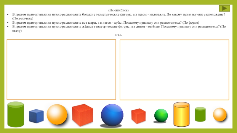 В правом прямоугольники нужно расположить все шары, а в левом - кубы. По какому признаку они расположены? (По форме)