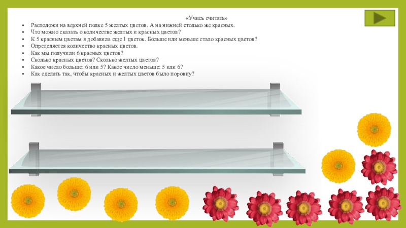 «Учись считать»Расположи на верхней полке 5 желтых цветов. А на нижней столько же красных.Что можно сказать о