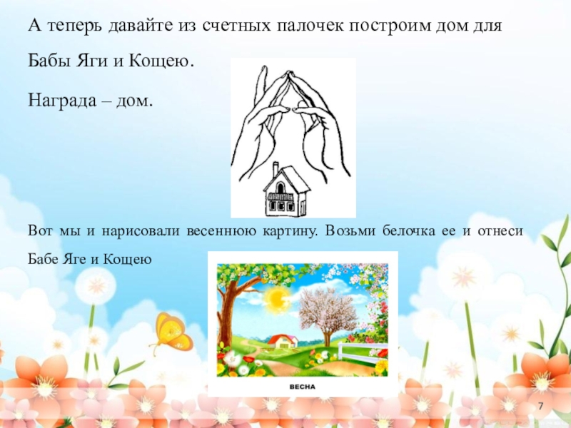 Баба Яга и Кощей Бессмертный украли Весну. А чтобы Весна вернулась необходимо Баба Яга и Кощею подарить весеннюю картину.