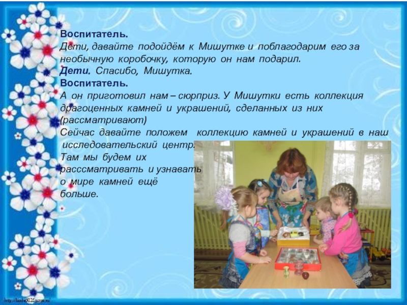 А он приготовил нам – сюрприз. У Мишутки есть коллекция драгоценных камней и украшений, сделанных из них (рассматривают)