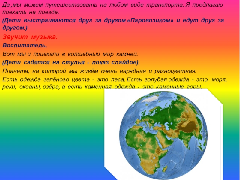 А чтобы узнать о камнях много интересного я предлагаю Вам отправится в волшебный мир камней. Дети, скажите на чём можно отправиться в путешествие. (ответы детей)