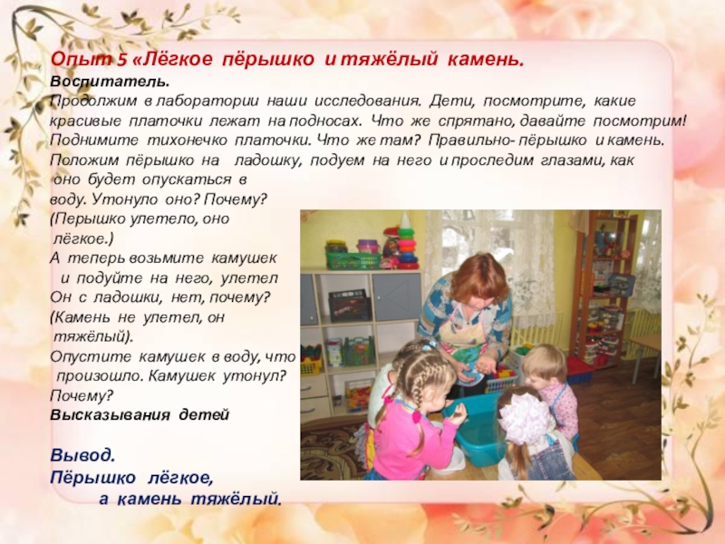 Слайд 17Опыт 5 «Лёгкое пёрышко и тяжёлый камень.
