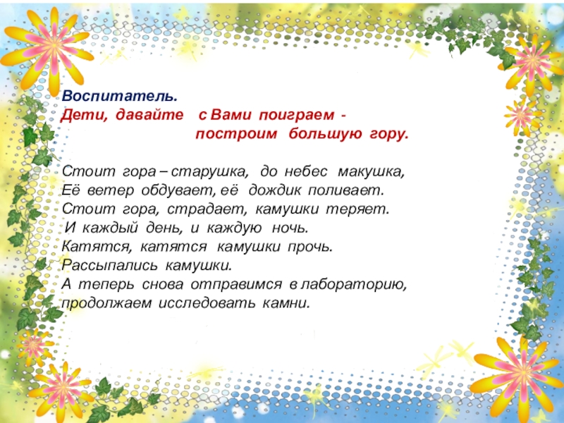 А теперь найдите и покажите большой камень. Молодцы!