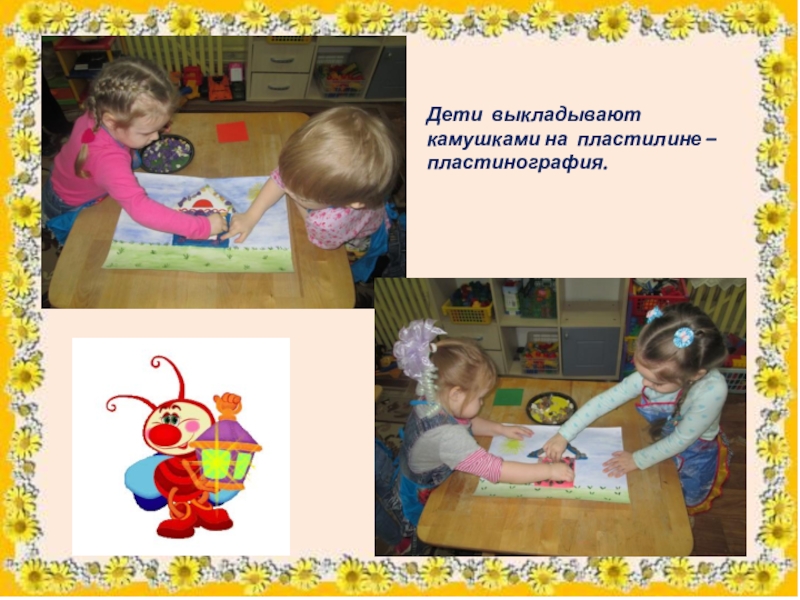 Слайд 22Дети выкладывают камушками на пластилине –