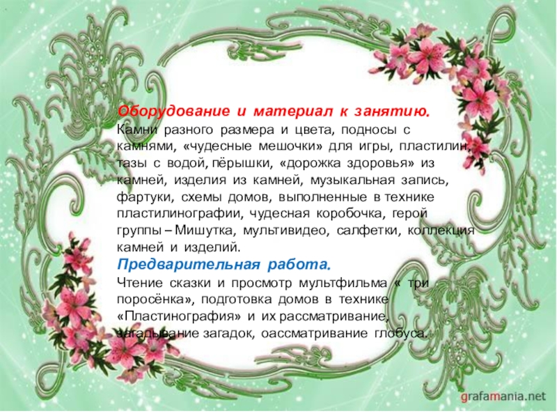 камнями, «чудесные мешочки» для игры, пластилин, тазы с водой, пёрышки, «дорожка здоровья» из камней, изделия из камней, музыкальная запись, фартуки, схемы домов, выполненные в технике пластилинографии, чудесная коробочка, герой группы – Мишутка, мультивидео, салфетки, коллекция камней и изделий.