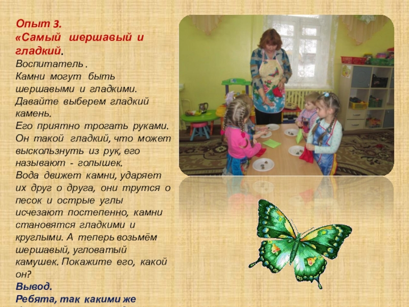 Вода движет камни, ударяет их друг о друга, они трутся о песок и острые углы исчезают постепенно, камни становятся гладкими и круглыми. А теперь возьмём шершавый, угловатый камушек. Покажите его, какой он?