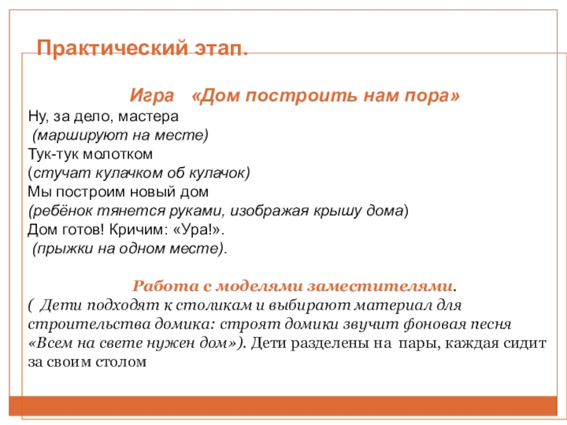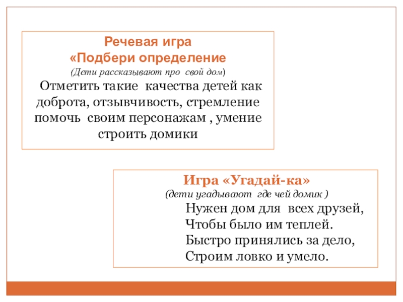 Отметить такие качества детей как доброта, отзывчивость, стремление помочь своим персонажам , умение строить домики