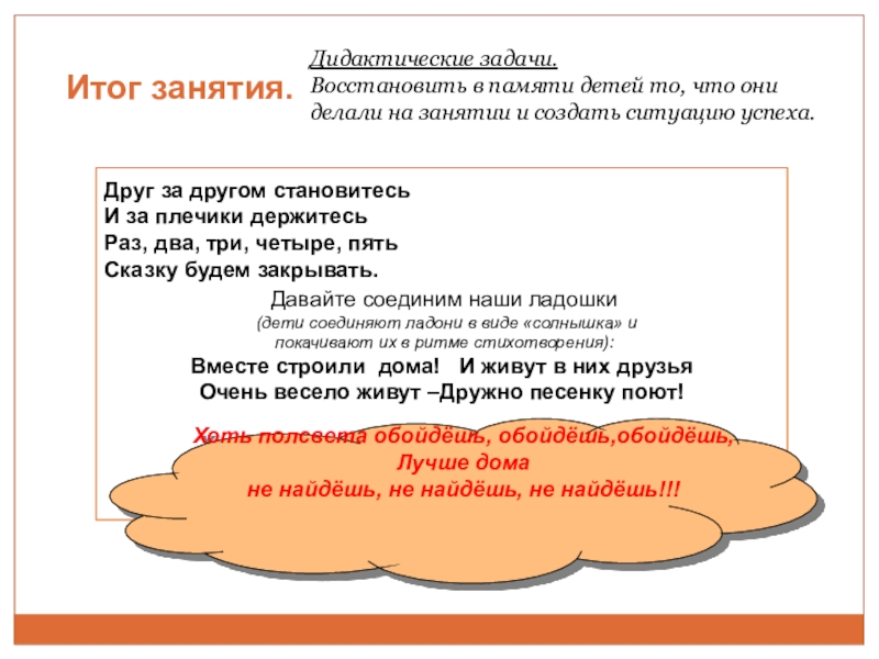 Восстановить в памяти детей то, что они делали на занятии и создать ситуацию успеха.