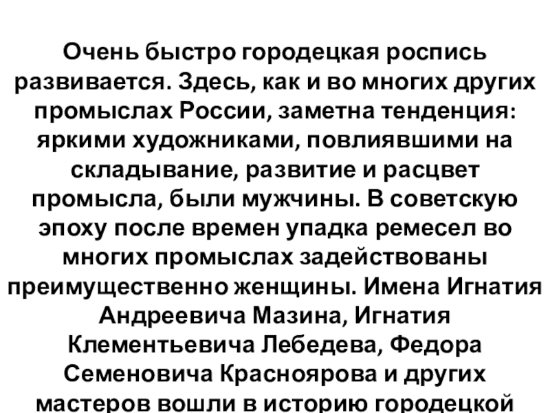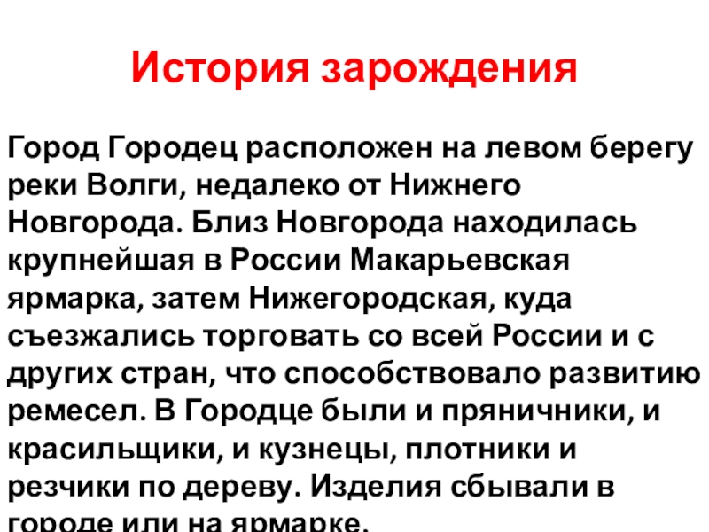 Нижнего Новгорода. Близ Новгорода находилась крупнейшая в России Макарьевская ярмарка, затем Нижегородская, куда съезжались торговать со всей России и с других стран, что способствовало развитию ремесел. В Городце были и пряничники, и красильщики, и кузнецы, плотники и резчики по дереву. Изделия сбывали в городе или на ярмарке.