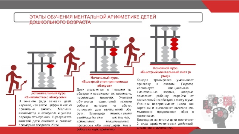 Дети знакомятся с числами на абакусе и осваивают их тактильно, перемещая косточки. Ученики обучаются правильной технике работы пальцев на абаке, используя для вычислений обе руки. Благодаря интенсивному взаимодействию тактильных, зрительных мыслительных процессов оба полушария мозга работают одновременно.