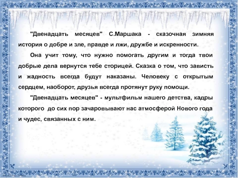 "Двенадцать месяцев" С.Маршака - сказочная зимняя история о добре и зле, правде и лжи, дружбе и искренности. Она учит тому, что нужно помогать другим и тогда твои добрые дела вернутся тебе сторицей. Сказка о том, что