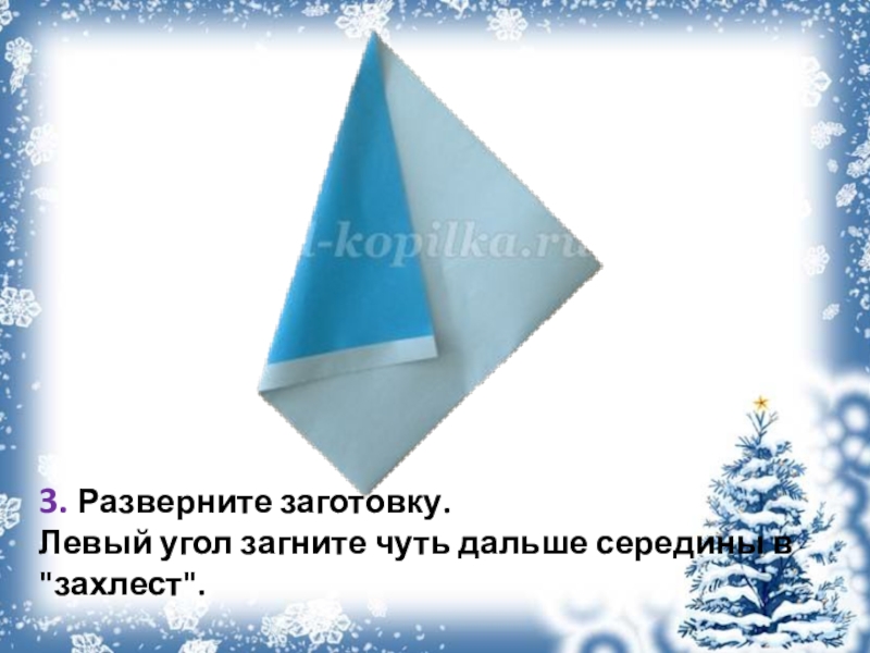 3. Разверните заготовку.  Левый угол загните чуть дальше середины в