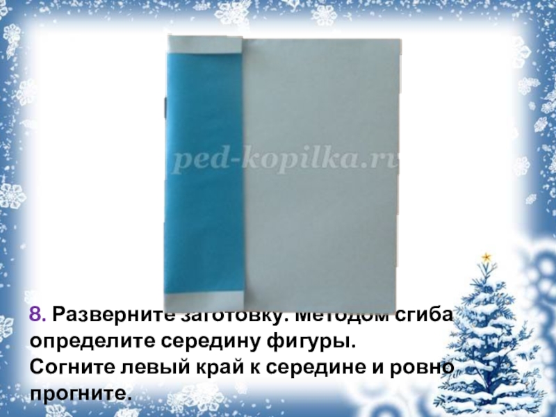 8. Разверните заготовку. Методом сгиба определите середину фигуры. Согните левый край к середине и ровно прогните.