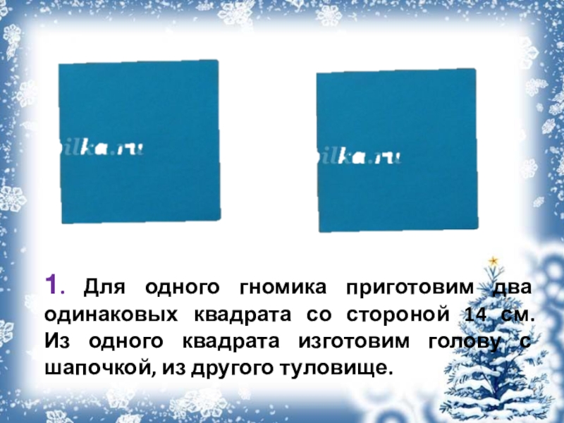 1. Для одного гномика приготовим два одинаковых квадрата со стороной 14 см.  Из одного квадрата изготовим голову
