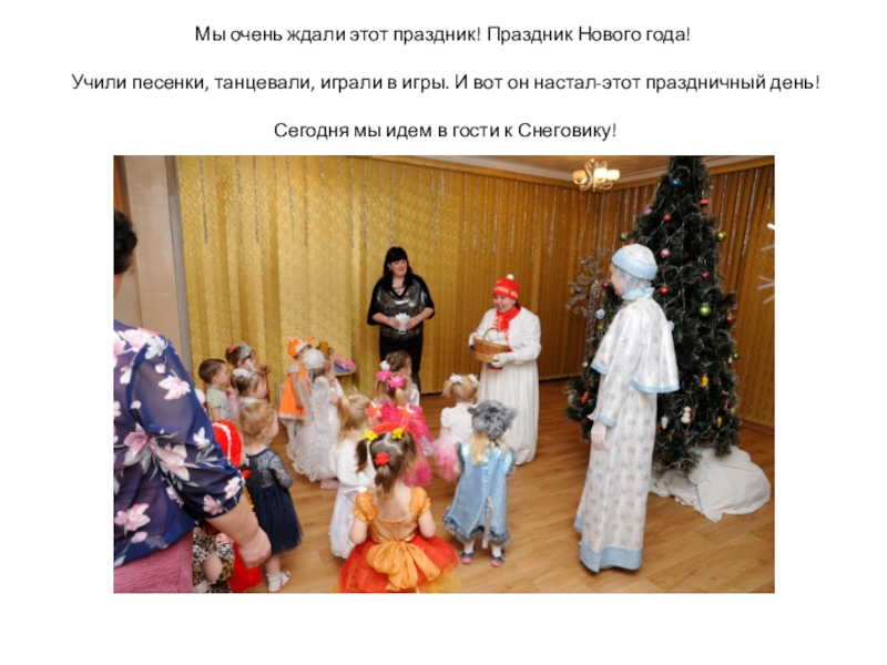 Мы очень ждали этот праздник! Праздник Нового года! Учили песенки, танцевали, играли в игры. И вот он настал-этот праздничный день! Сегодня мы идем в гости к Снеговику!