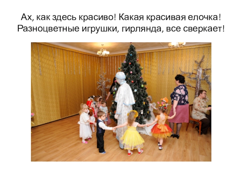 Слайд 3Ах, как здесь красиво! Какая красивая елочка! Разноцветные игрушки, гирлянда, все