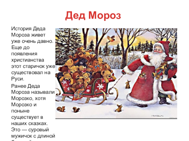 Ранее Деда Мороза называли Морозко, хотя Морозко и поныне существует в наших сказках. Это — суровый мужичок с длиной бородой, настоящий хозяин зимы.