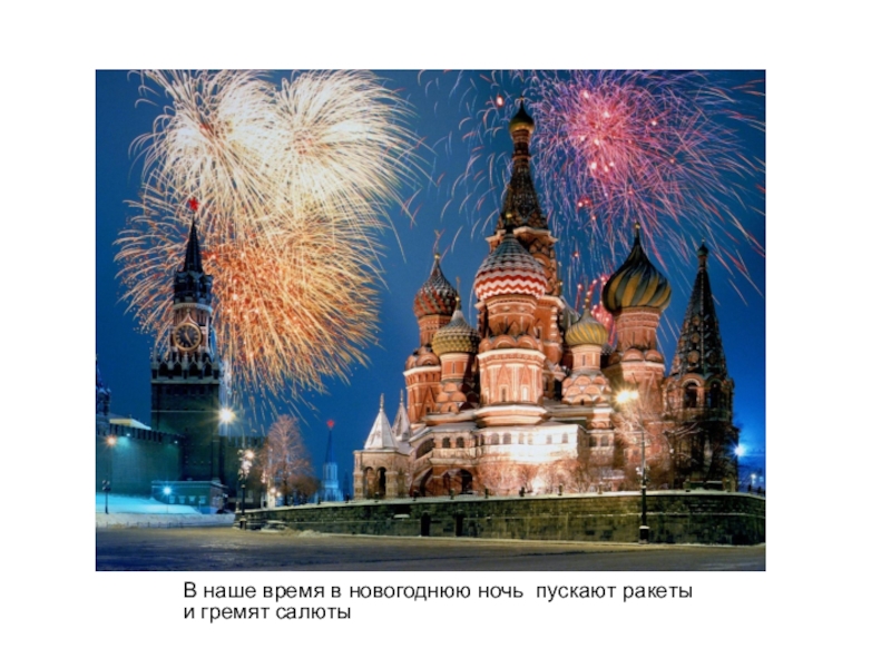 Слайд 7В наше время в новогоднюю ночь пускают ракеты и гремят салюты