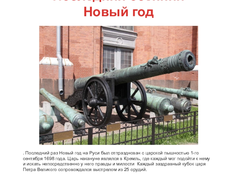 отпразднован с царской пышностью 1-го сентября 1698 года. Царь накануне являлся в Кремль, где каждый мог подойти к нему и искать непосредственно у него правды и милости Каждый заздравный кубок царя Петра Великого сопровождался выстрелом из 25 орудий.