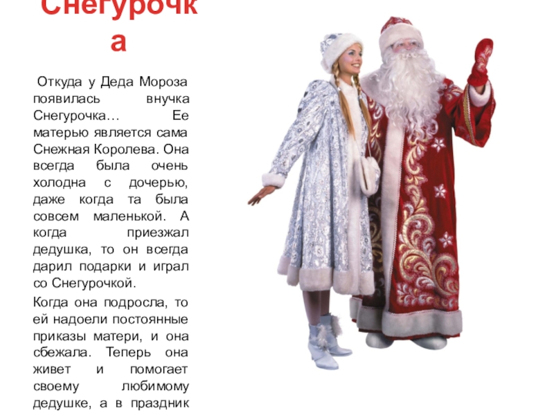 Когда она подросла, то ей надоели постоянные приказы матери, и она сбежала. Теперь она живет и помогает своему любимому дедушке, а в праздник зимы они вместе радуют детей долгожданными подарками на Новый год. Вот такая вот добрая история Деда Мороза и Снегурочки.