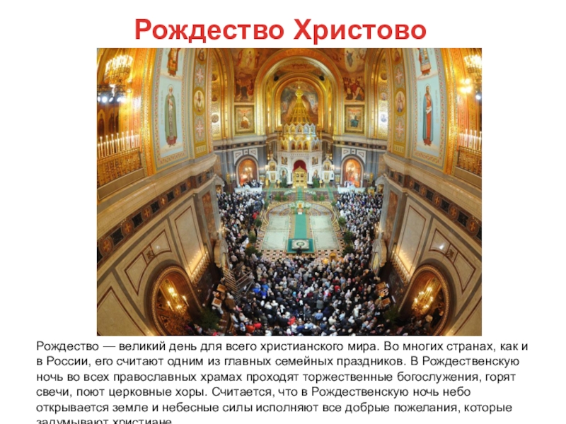 странах, как и в России, его считают одним из главных семейных праздников. В Рождественскую ночь во всех православных храмах проходят торжественные богослужения, горят свечи, поют церковные хоры. Считается, что в Рождественскую ночь небо открывается земле и небесные силы исполняют все добрые пожелания, которые задумывают христиане.