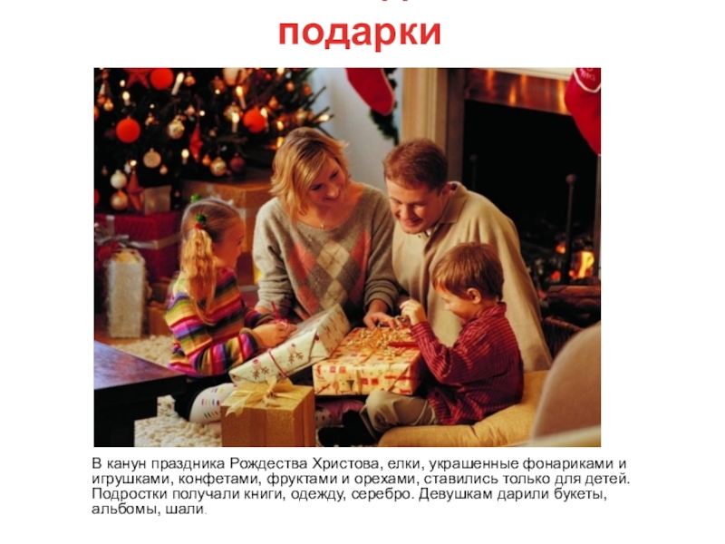 игрушками, конфетами, фруктами и орехами, ставились только для детей. Подростки получали книги, одежду, серебро. Девушкам дарили букеты, альбомы, шали.