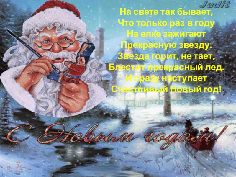 На свете так бывает,Что только раз в годуНа елке зажигаютПрекрасную звезду.Звезда горит, не тает,Блестит прекрасный лед.И сразу наступаетСчастливый Новый год!
