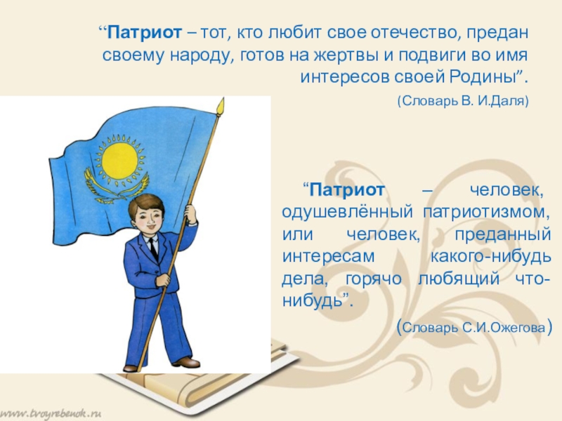 “Патриот – человек, одушевлённый патриотизмом, или человек, преданный интересам какого-нибудь дела, горячо любящий что-нибудь”.