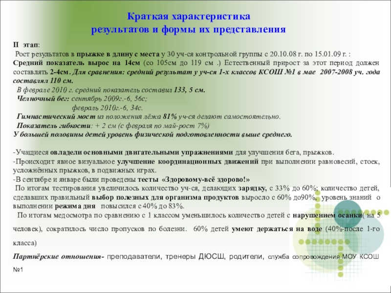 Средний показатель вырос на 14см (со 105см до 119 см .) Естественный прирост за этот период должен составлять 2-4см. Для сравнения: средний результат у уч-ся 1-х классов КСОШ №1 в мае 2007-2008 уч. года составлял 110 см.